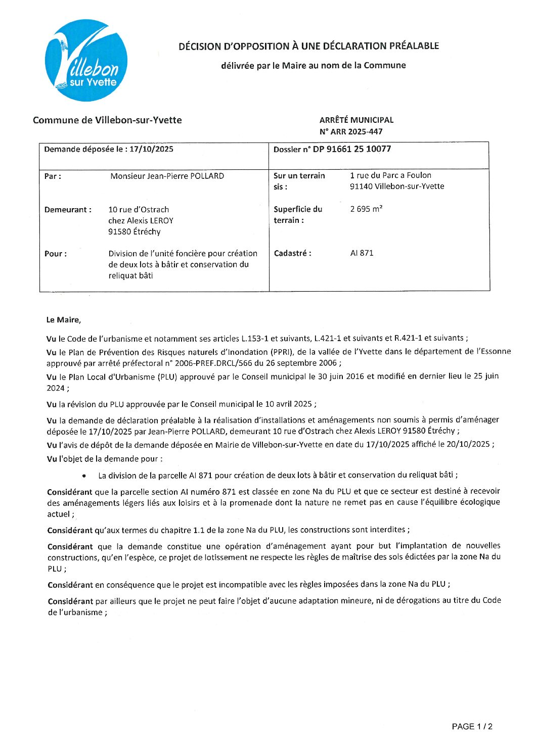 ARR-2025-447 Décision d'opposition à une déclaration préalable 1 rue du Parc à Foulon