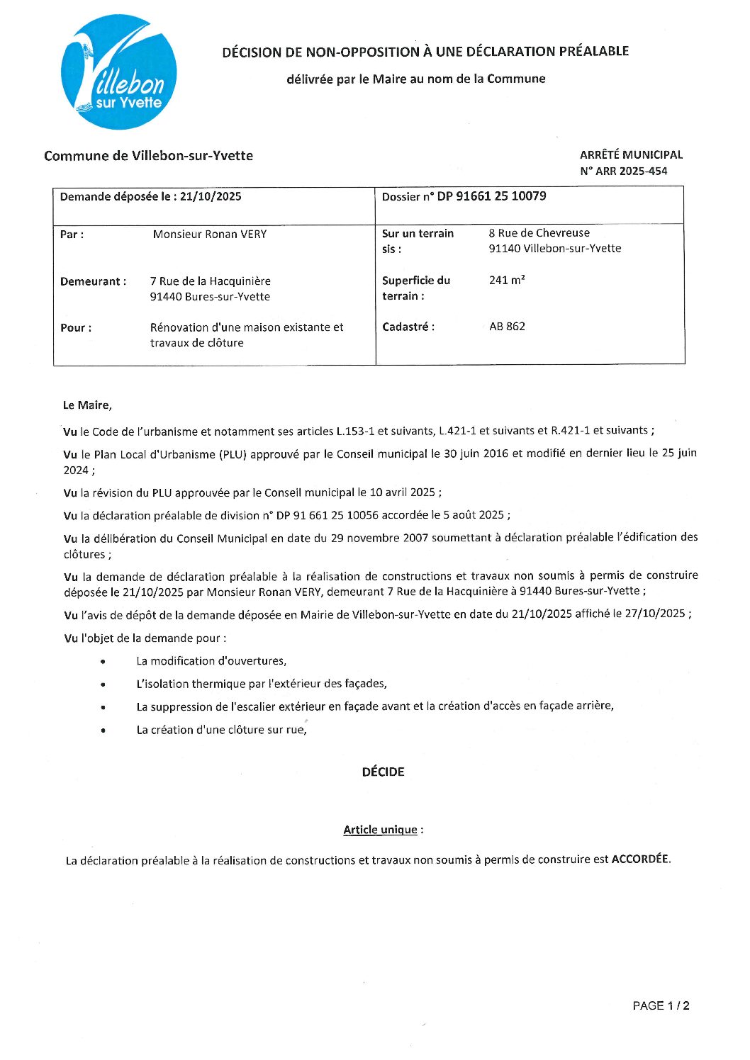 ARR-2025-454 Décision de non-opposition à une déclaration préalable de travaux 8 rue de Chevreuse