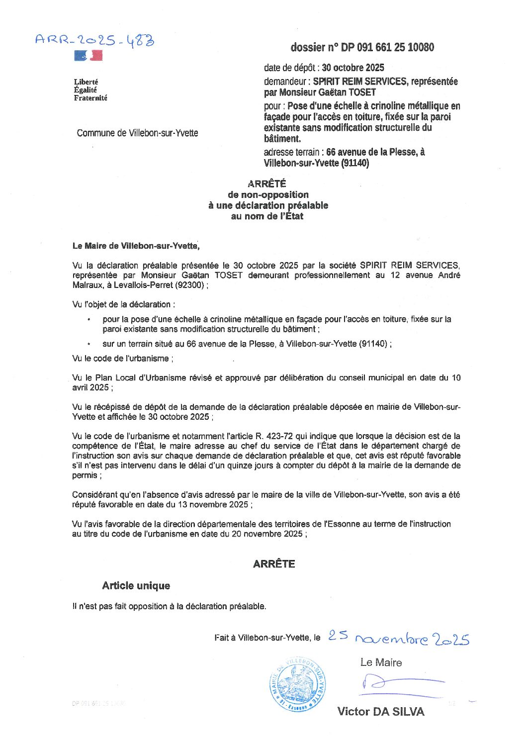 ARR-2025-483 Arrêté de non-opposition à une déclaration préalable au nom de l'Etat 66 av de la Plesse