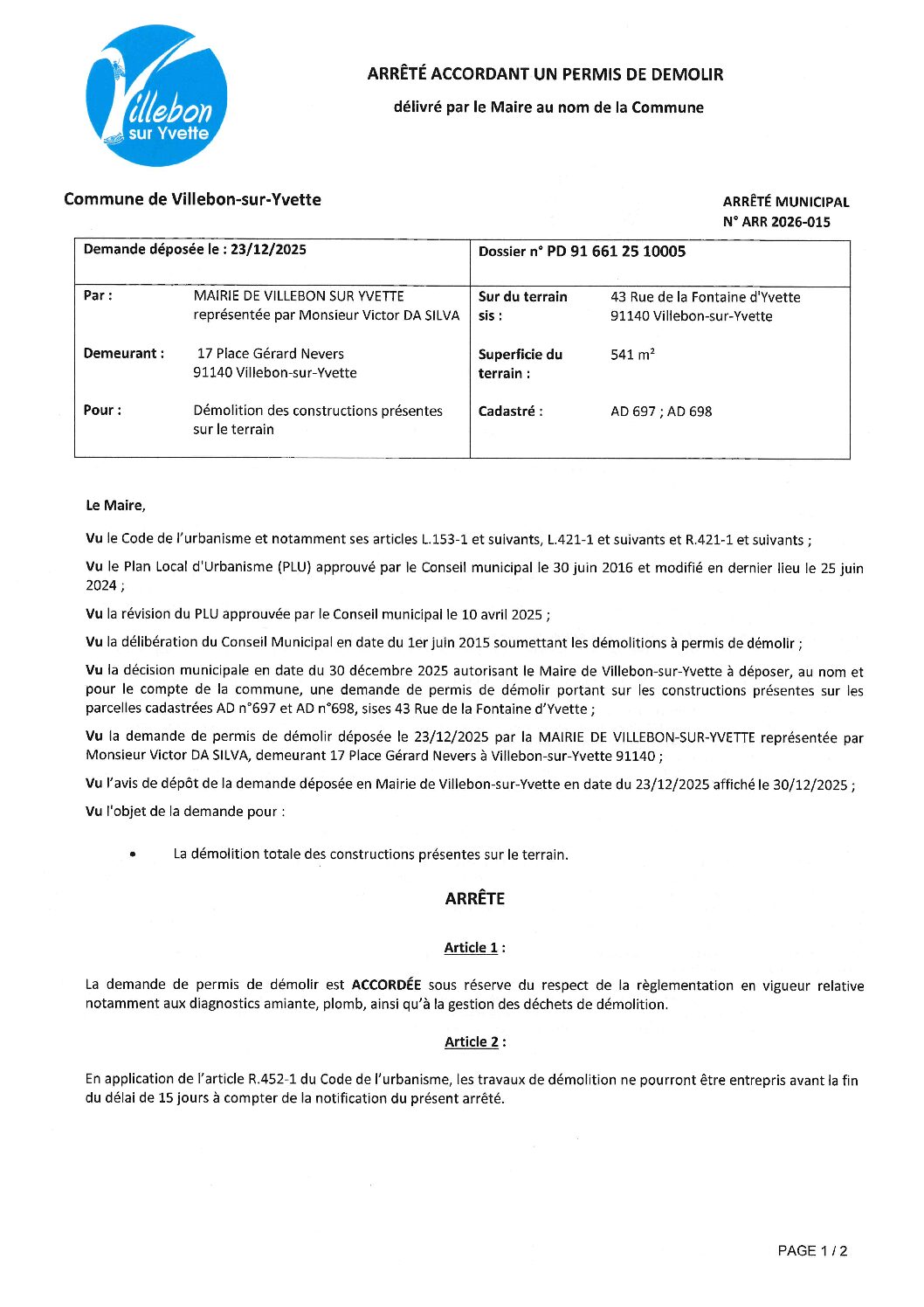 ARR-2026-015-Arrêté accordant un permis de démolir 43 rue de la Fontaine d'Yvette