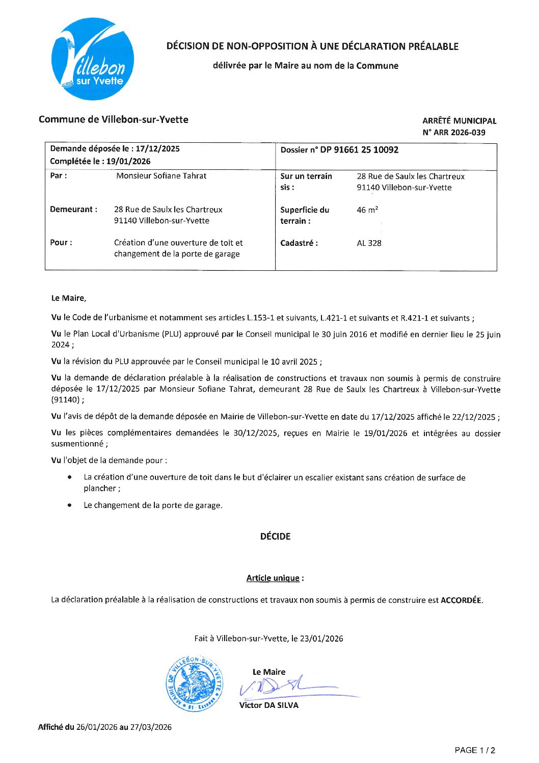 ARR-2026-039 Décision de non-opposition à une déclaration préalable 28 rue de Saulx les Chartreux