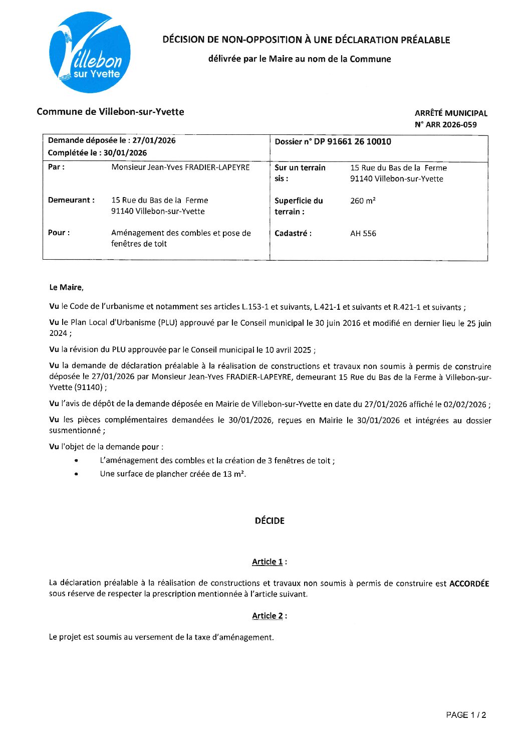 ARR-2026-059 Décision de non-opposition à une déclaration préalable 15 rue du bas de la Ferme