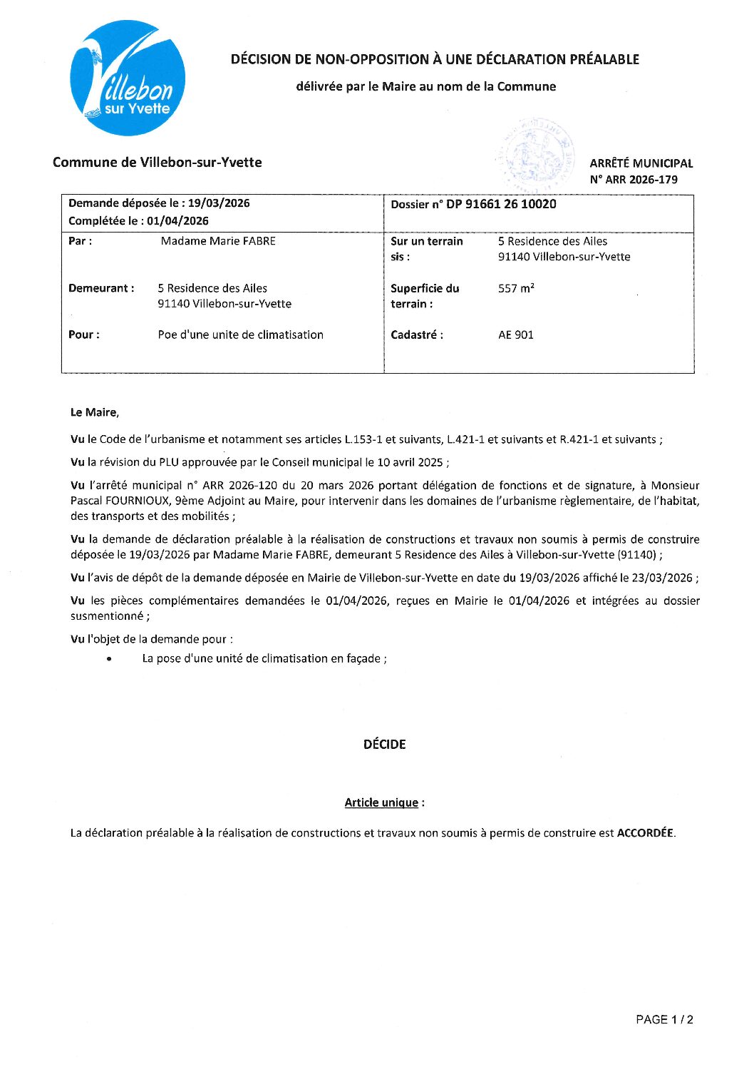 ARR-2026-179 Décision de non-opposition à une déclaration préalable-5 résidence des Ailes