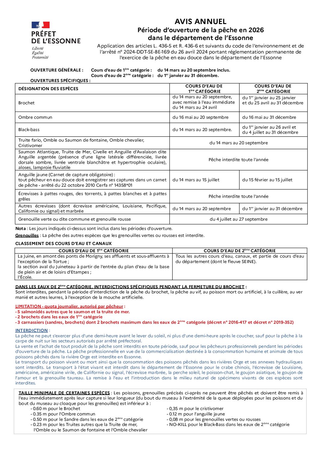47 – Préfet de l'Essonne Période d'ouverture de la pêche en 2026 dans l'Essonne