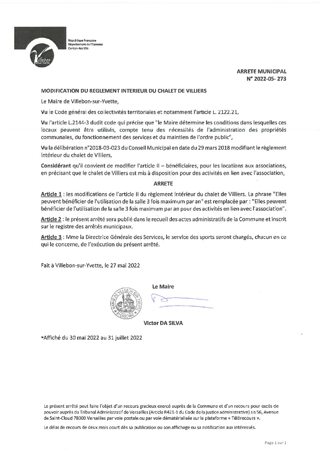 ARR-2022-05-273 Modification du réglement intérieur du chalet de Villiers