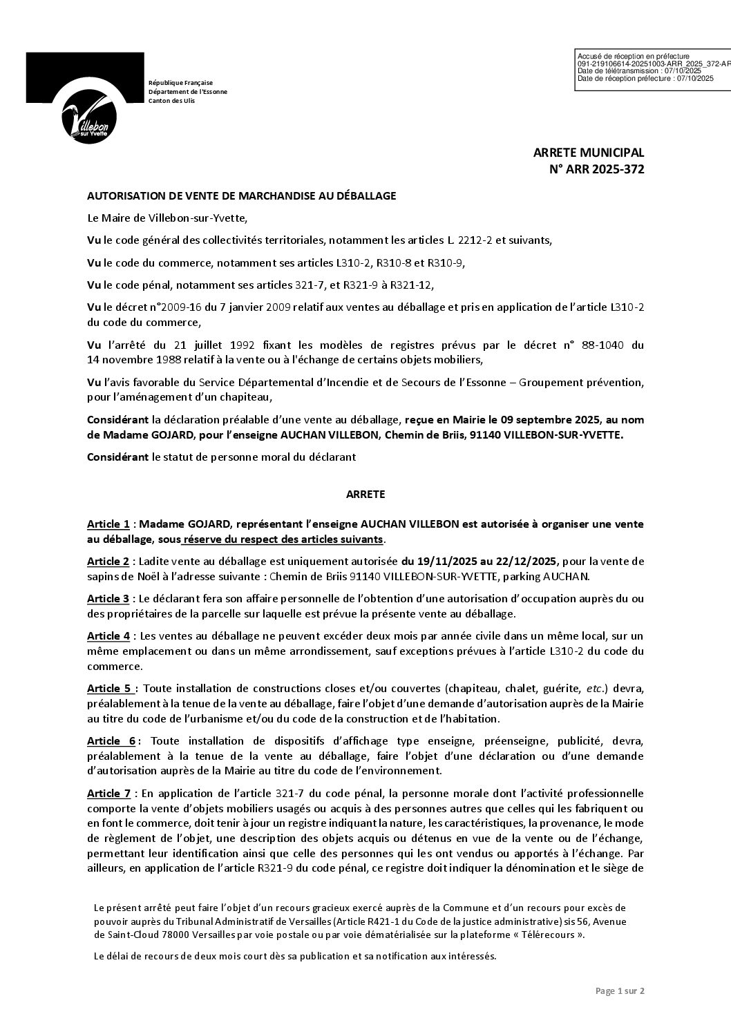 ARR-2025-372 Autorisation de vente de marchandise au déballage