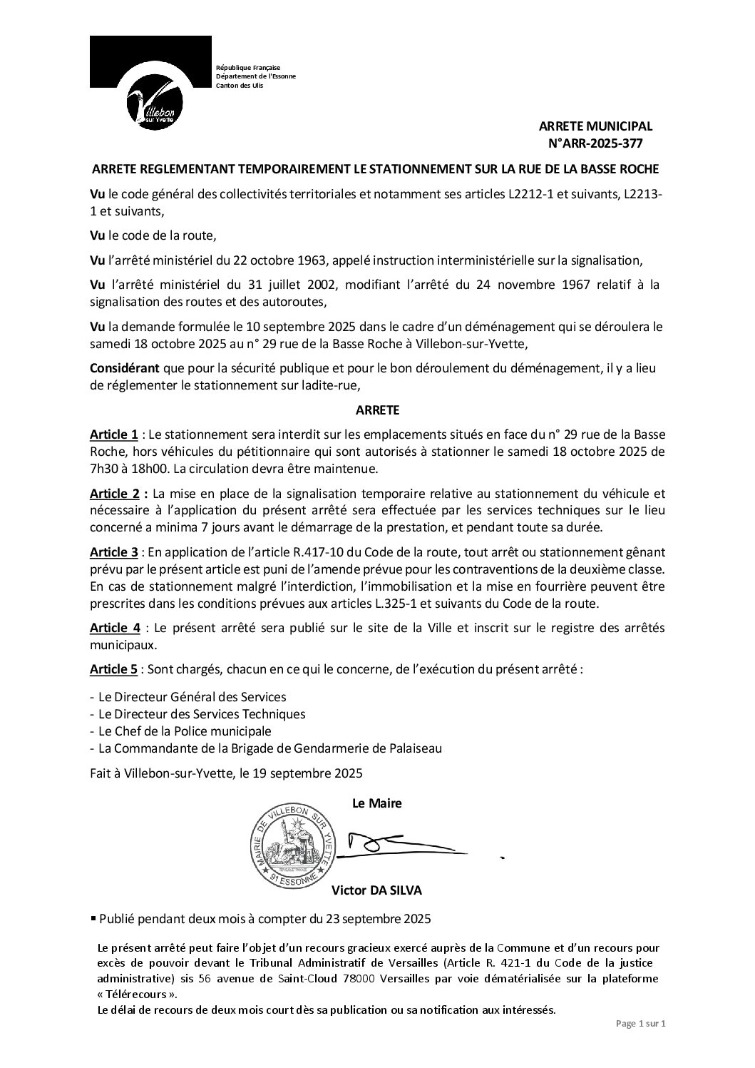 ARR-2025-377 Arrêté réglementant temporairement le stationnement sur la rue de la Basse Roche