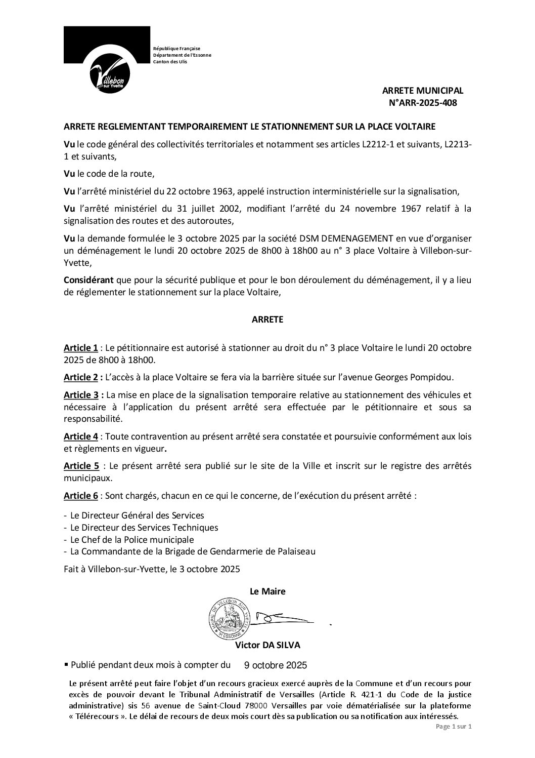 ARR-2025-408 Arrêté réglementant temporairement le stationnement sur la place Voltaire