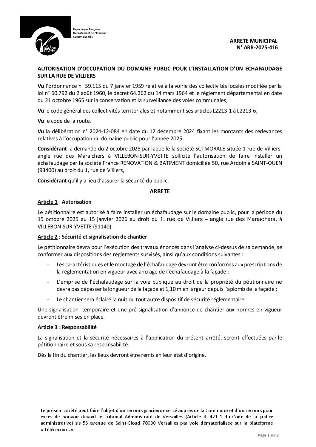 Autorisation d'occupation du domaine public pour l'installation d'un echafaudage sur la rue de Villiers