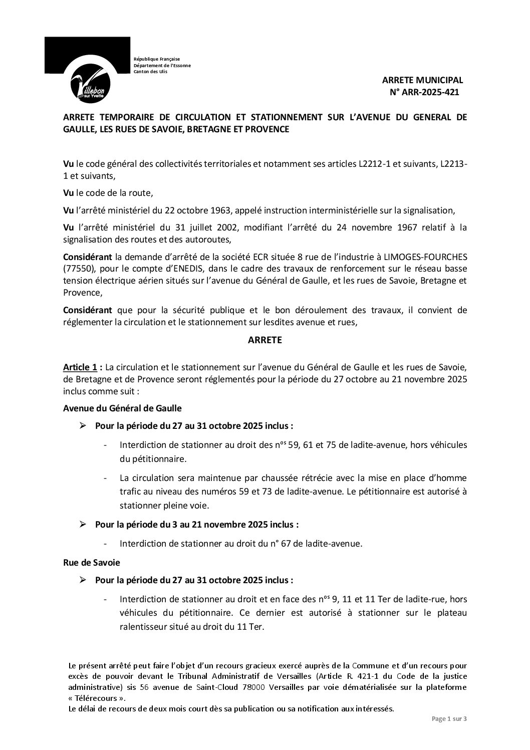 Arrêtés temporaires:ARR-2025-421 Arrêté temporaire de circulation et stationnement sur l’avenue Général de Gaulle, les rues de Savoie, Bretagne et Provence