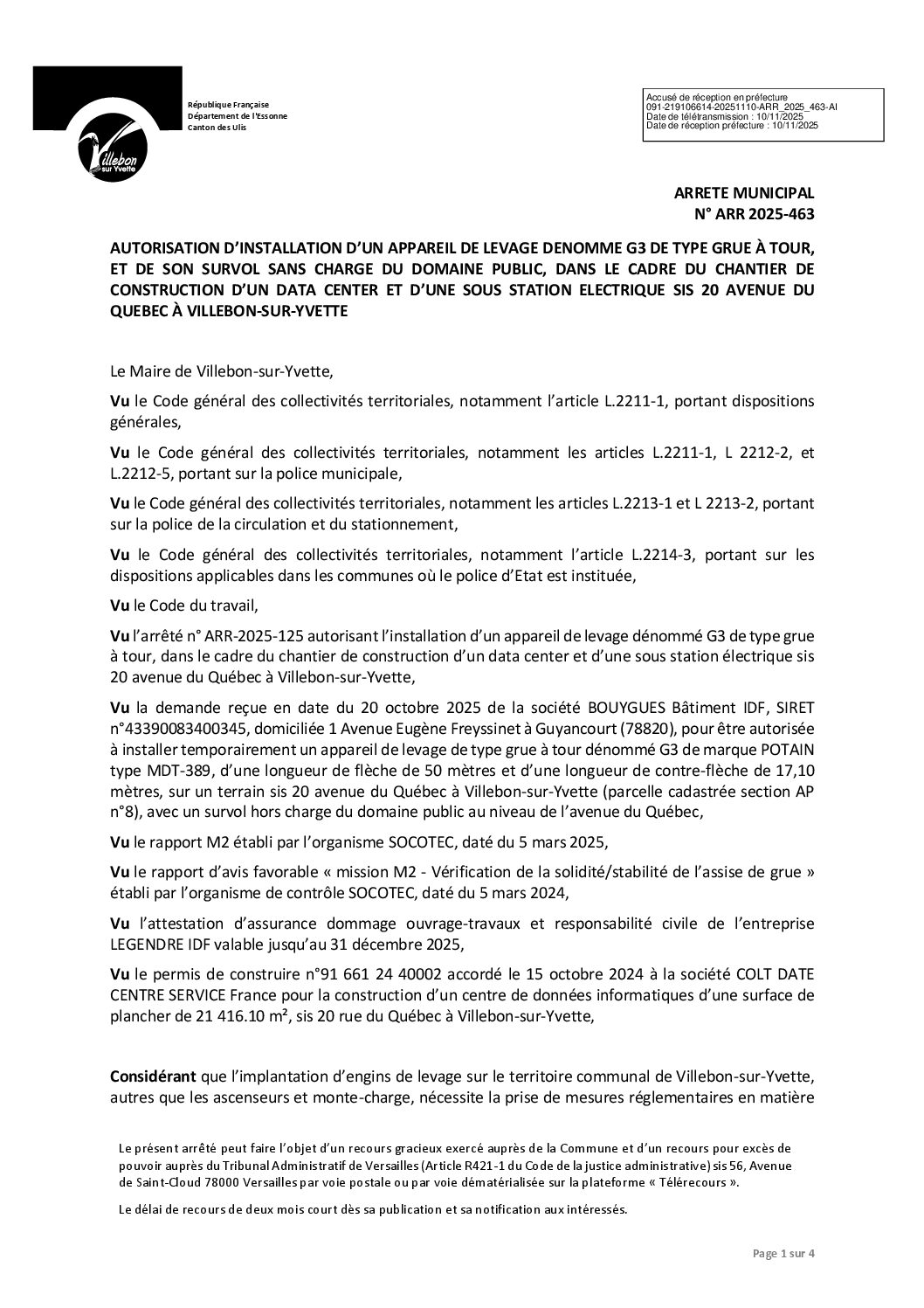 ARR-2025-463 Arrêté autorisant l'installation d'un appareil de levage dénommé G3 sis 20 AV du Québec