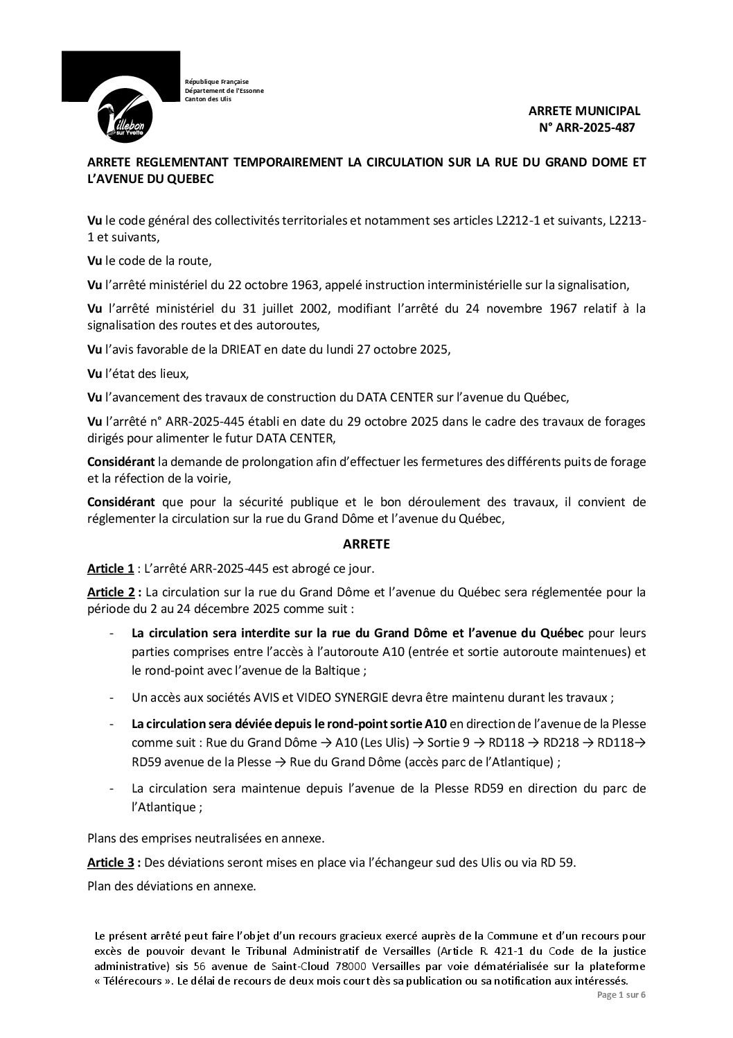ARR-2025-487 Arrêté réglementant temporairement la circulation sur la rue du grand dôme et l'avenue du Québec