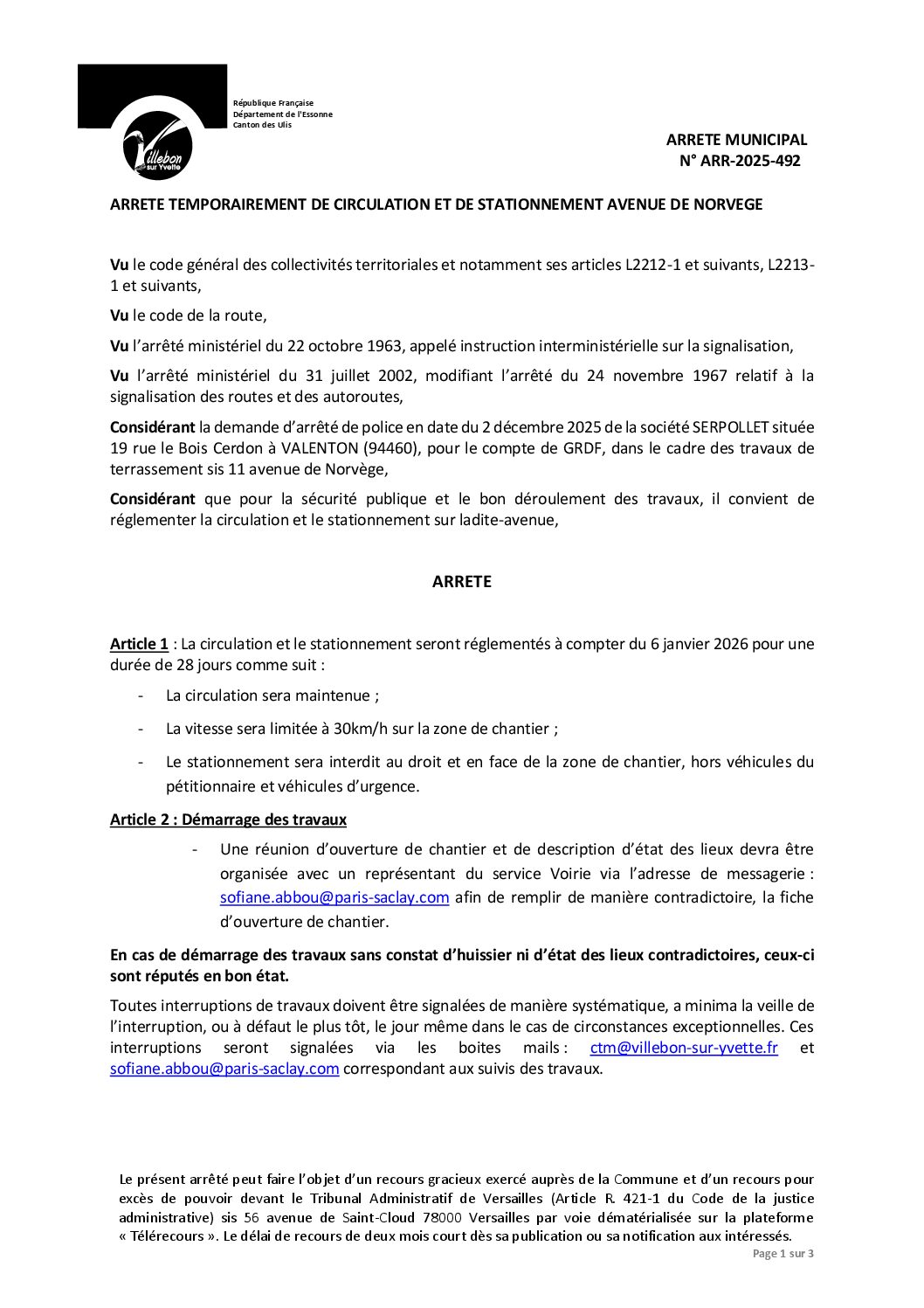 ARR-2025-492 Arrêté temporairement de circulation et de stationnement avenue de Norvège