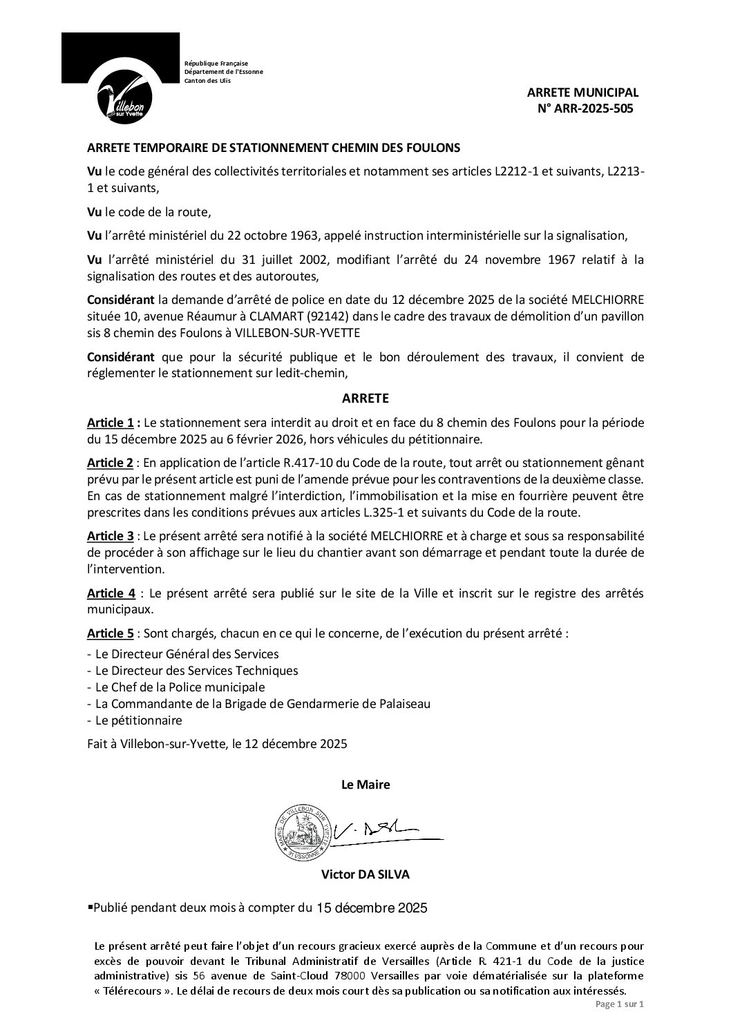 ARR-2025-505 Arrêté temporaire de stationnement Chemin des Foulons