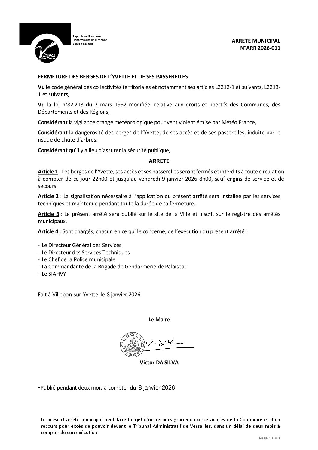 ARR-2026-011 Fermeture des berges de l'Yvette et de ses passerelles