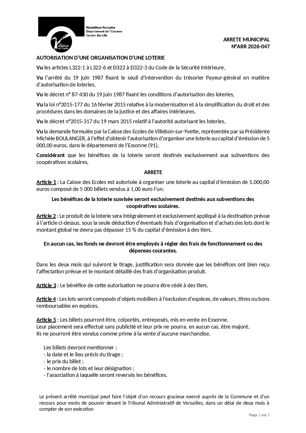 ARR-2026-047 Autorisation d'une organisation d'une loterie