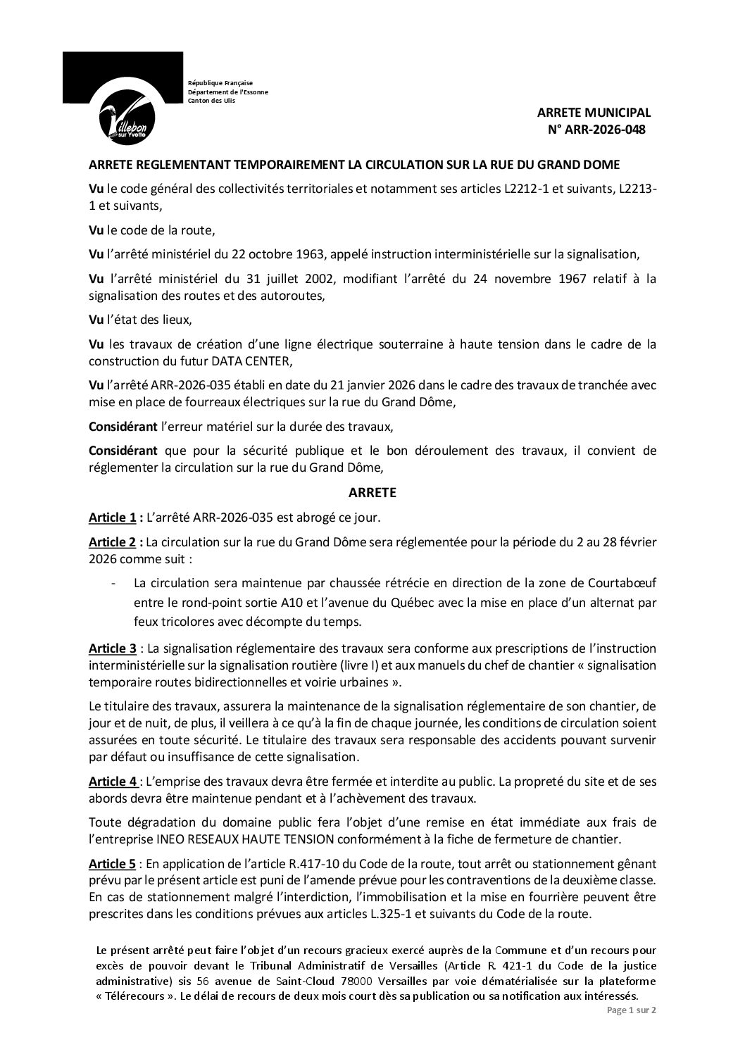 ARR-2026-048 Arrêté réglementant temporairement la circulation Rue du Grand Dôme