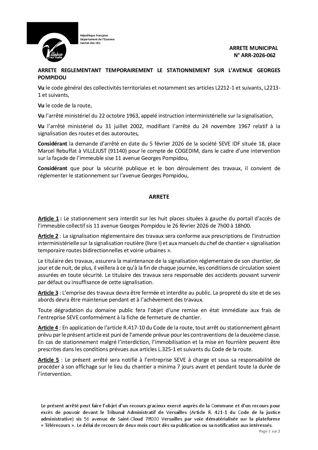 ARR-2026-062 Arrêté réglementant temporairement le stationnement sur l'avenue Georges Pompidou
