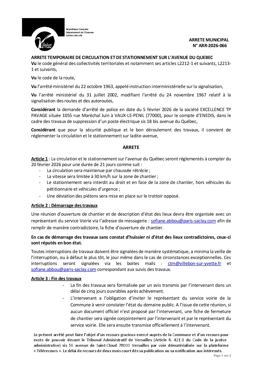 ARR-2026-066 Arrêté temporaire de circulation et de stationnement sur l'avenue du Quebec