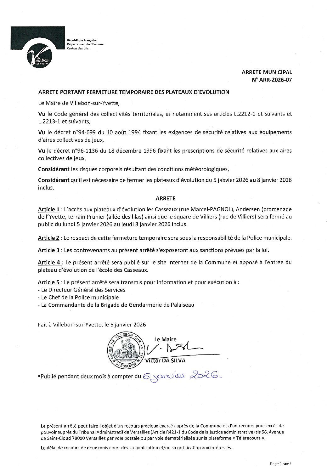 ARR-2026-07 Arrêté portant fermeture temporaire des plateaux d'évolution