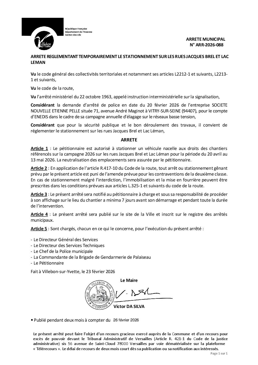 ARR-2026-088 Arrêté réglementant temporairement le stationnement sur les rues Jacques brel et lac Leman