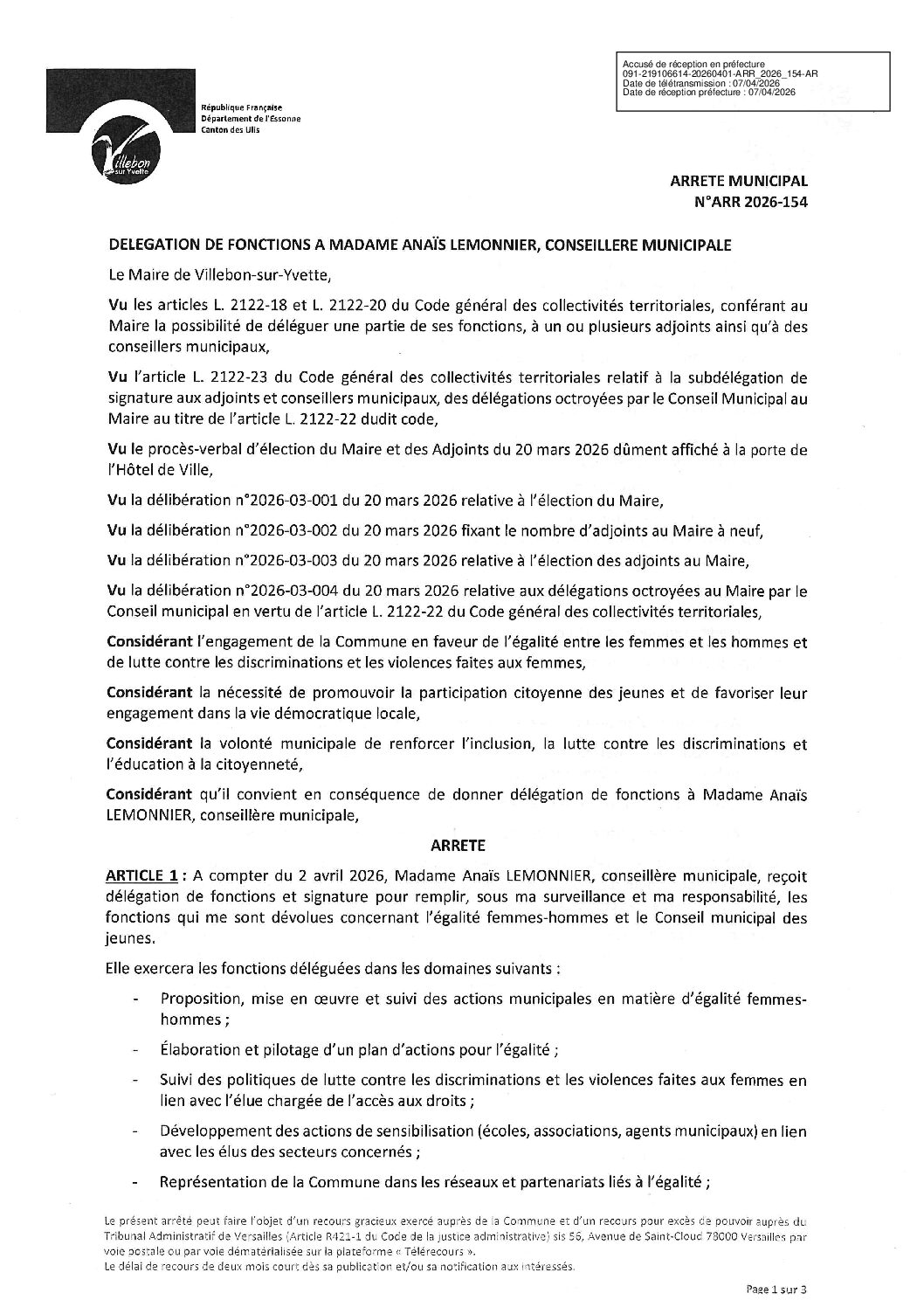 ARR-2026-154 Délégation de fonctions à Mme Anaïs Lemonnier, conseillère municipale