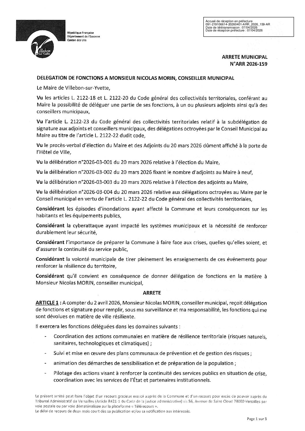 ARR-2026-159 Délégation de fonctions à M. Nicolas MORIN, conseiller municipal