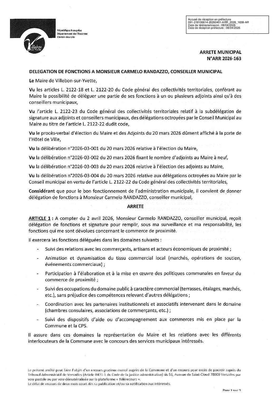 ARR-2026-163 Délégation de fonctions à M. Carmelo RANDAZZO, conseiller municipal