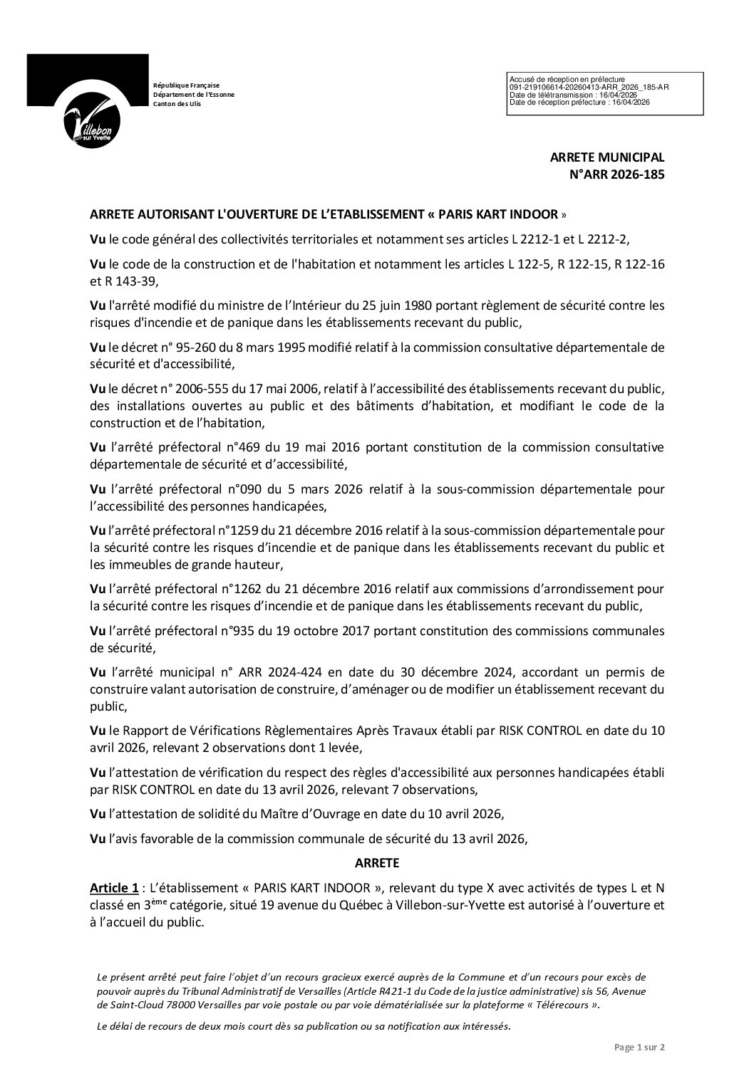 ARR-2026-185 Arrêté autorisant l'ouverture de l'établissement Paris Kart Indoor