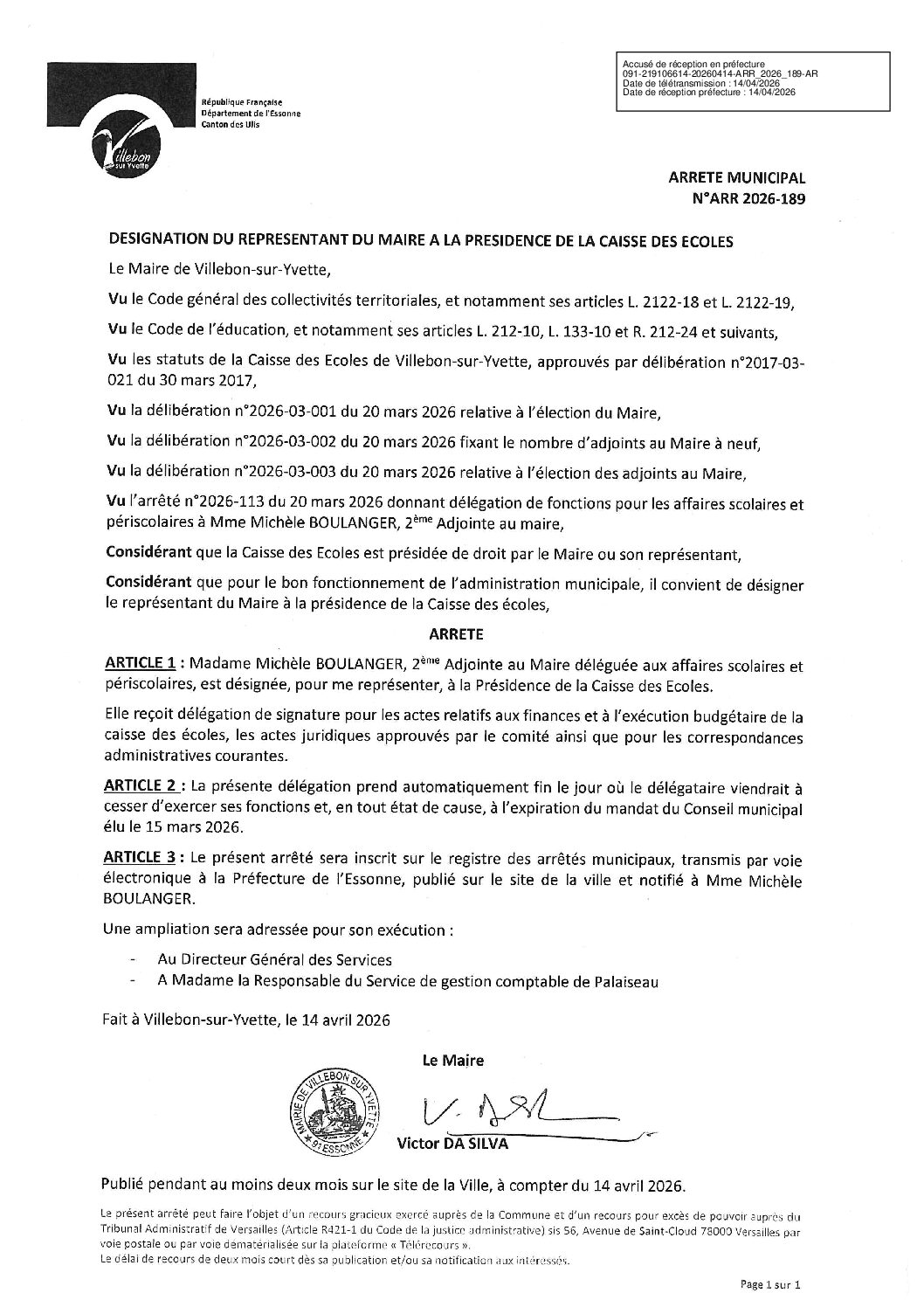 ARR-2026-189 Désignation du représentant du Maire à la présidence de la caisse des écoles