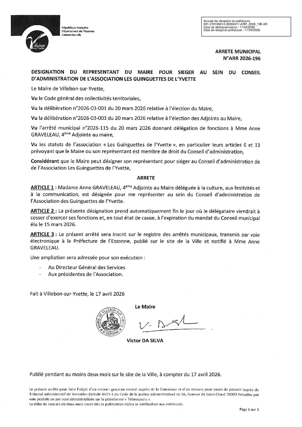 Arrêtés permanents:ARR-2026-196 Désignation du représentant du Maire pour siéger au sein du conseil d’administration de l’association les guinguettes de l’yvette
