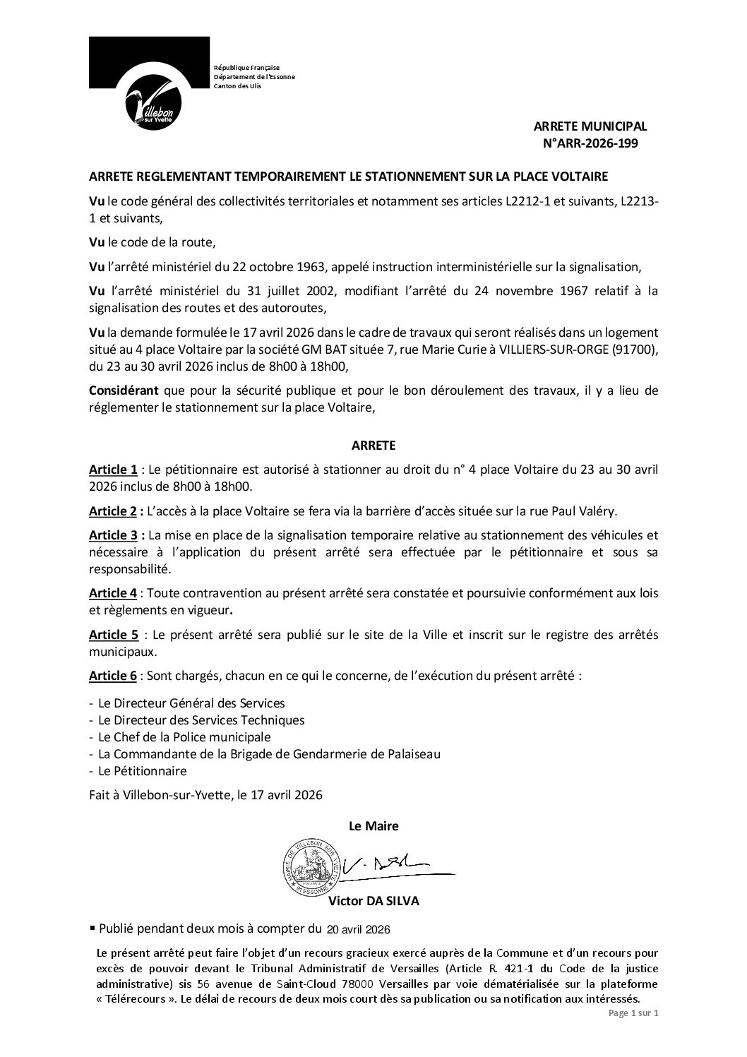 ARR-2026-199 Arrêté réglementant temporairement le stationnement sur la place Voltaire