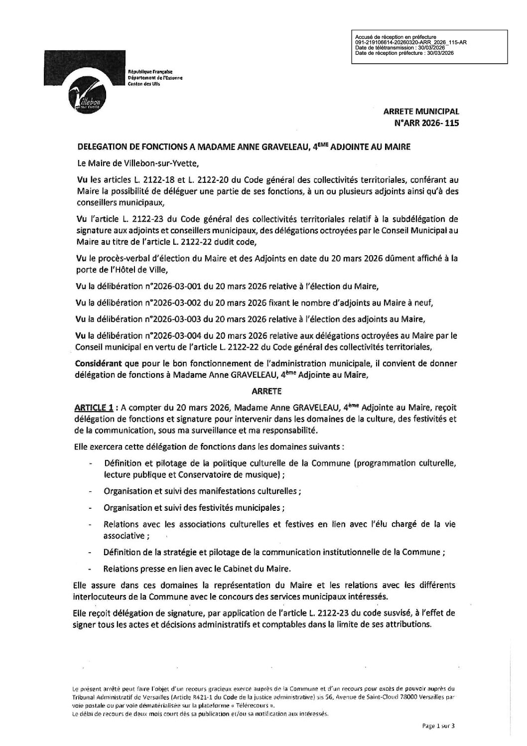 ARR_2026_115 Délégation de fonctions à Mme Anne GRAVELEAU, 4ème adjointe au maire