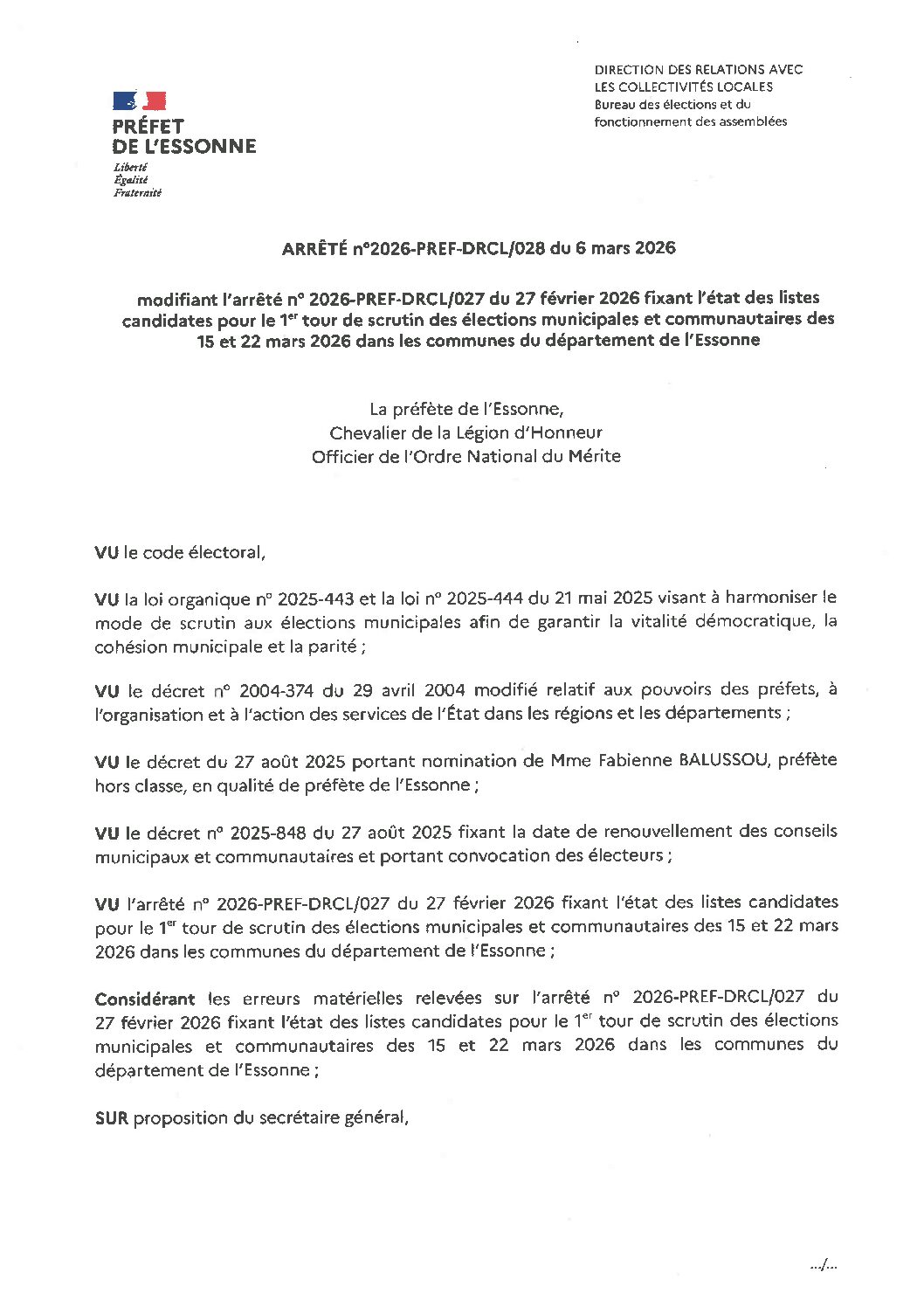 Documents préfectoraux:Arrêté n°2026-PREF-DRCL-028 modifiant l’arrêté n°2026-PREF-DRCL-027 du 27-02-26 fixant l’état des listes candidates pour le 1er tour de scrutin