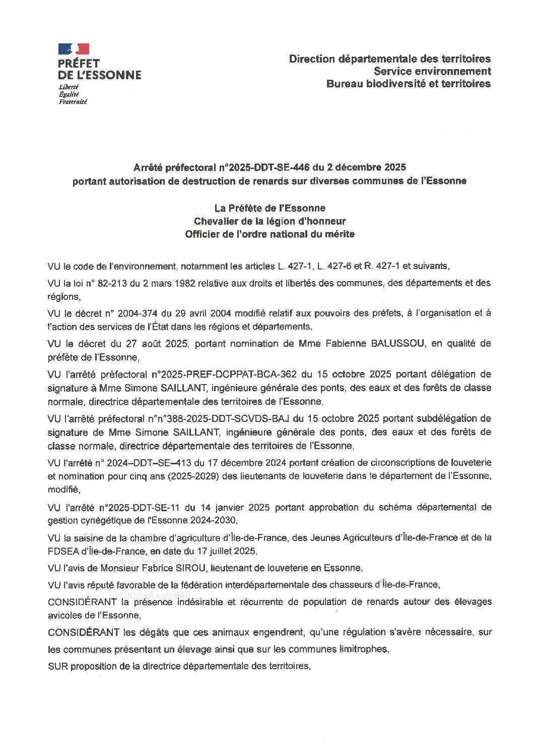 Arrêté préfectoral n°2025-DDT-SE-446 portant autorisation de destruction de renards sur diverses communes de l'Essonne