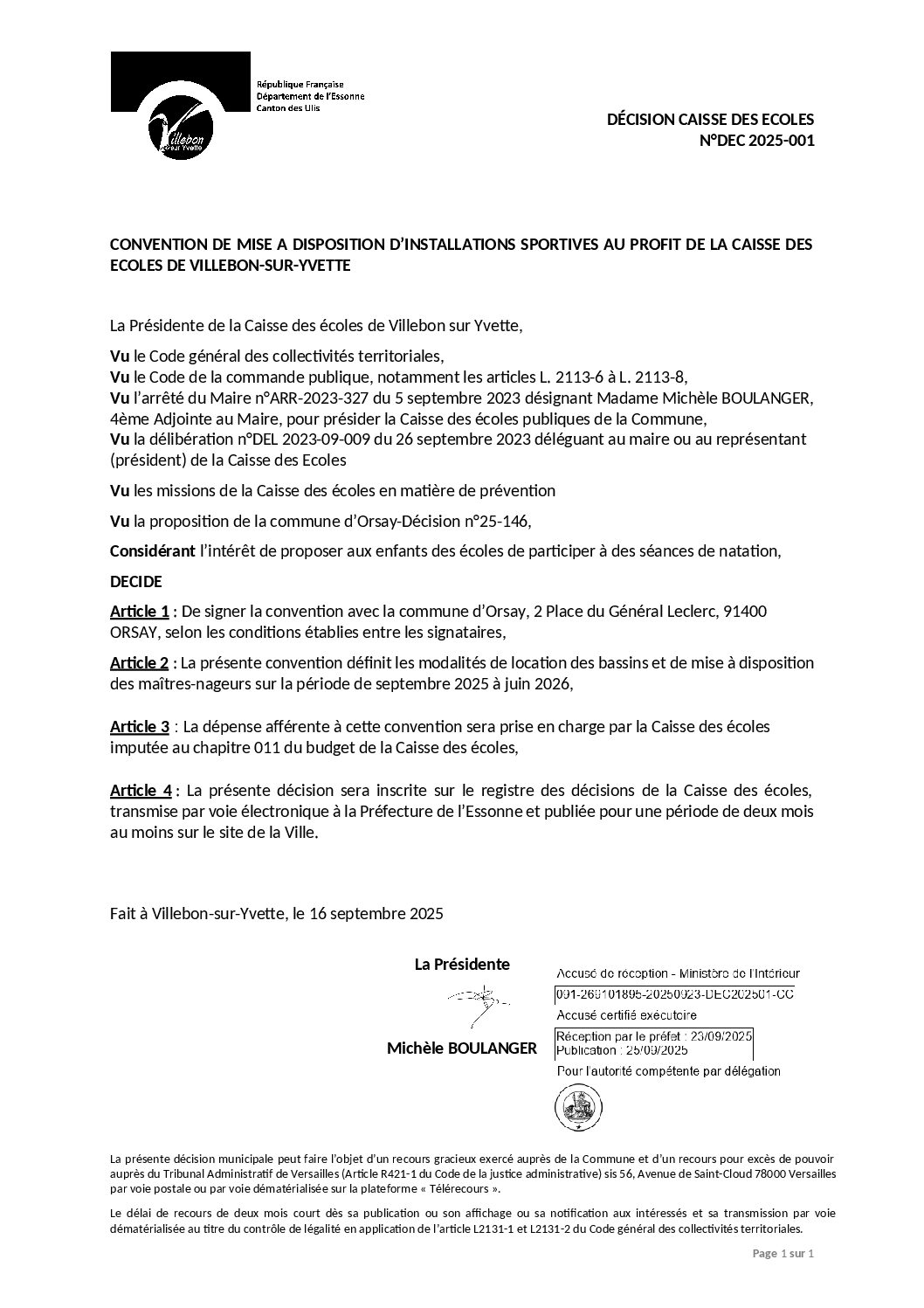 DEC-2025-001 Convention de mise à disposition d'installations sportives au profit de la caisse des écoles de Villebon-sur-Yvette