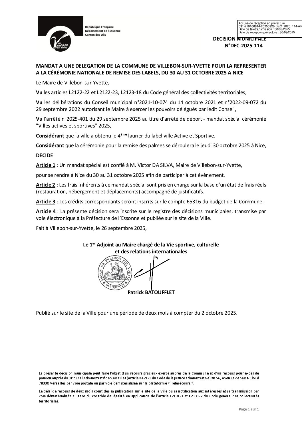 DEC-2025-114 Mandat à une délégation de la commune de Villebon-sur-yvette pour la représenter cérémonie nationale remise des labels à Nice