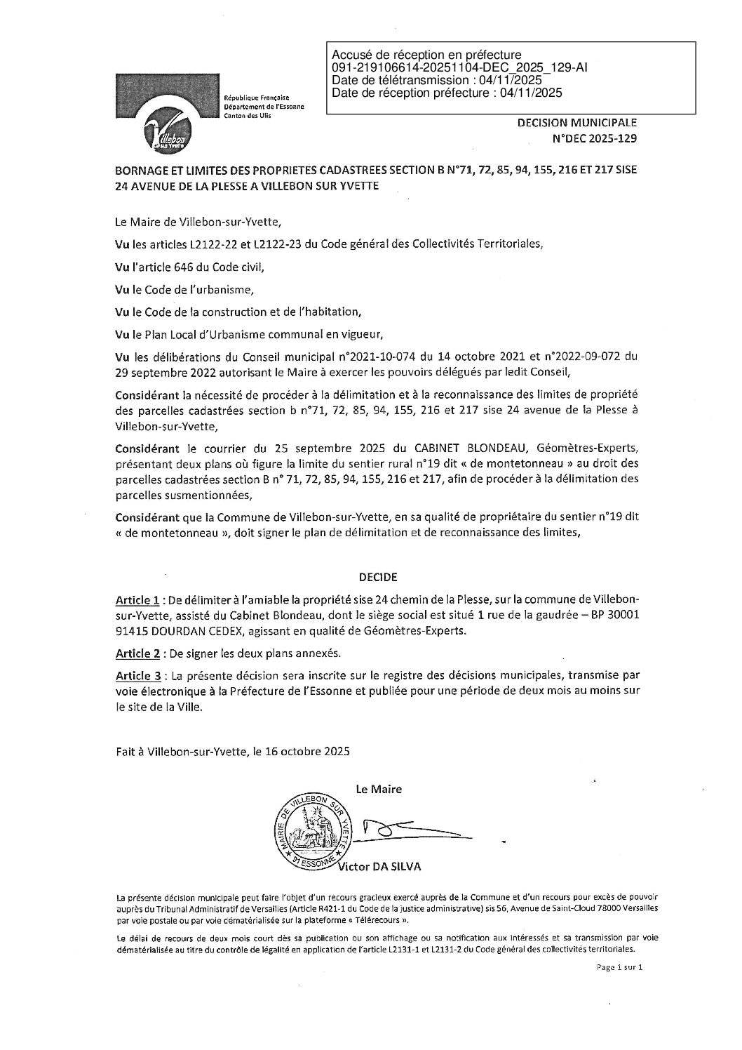 Arrêtés (urbanisme), Décisions municipales:DEC-2025-129 Bornage et limites de la propriété cadastrée B N. 71, 72, 85, 94, 155, 216 et 217 sise 24 av de la Plesse à VSY (1)