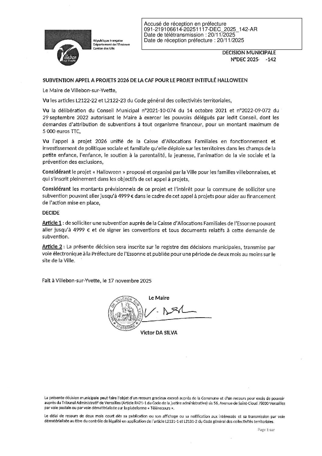DEC-2025-142 Subvention appel à projets 2026 de la CAF pour le projet intitulé Halloween