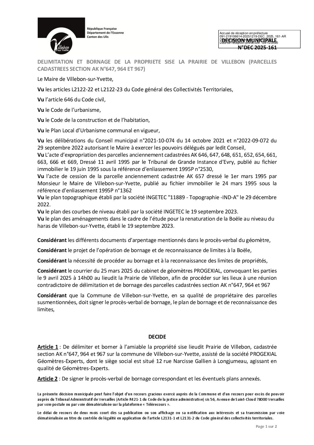 Délimitation et bornage de la prairie de villebon (parcelles cadastrées section Ak n°647, 964 et 967)