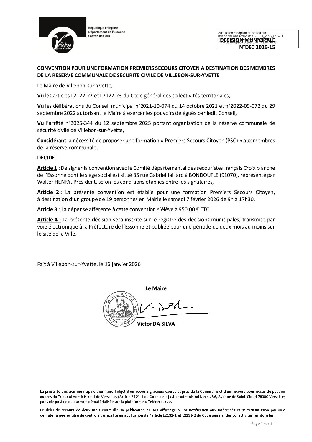 Décisions municipales:DEC-2026-015 Convention pour une formation premiers secours citoyen à destination des membres de la réserve communale de sécurité de Villebon-sur-Yvette