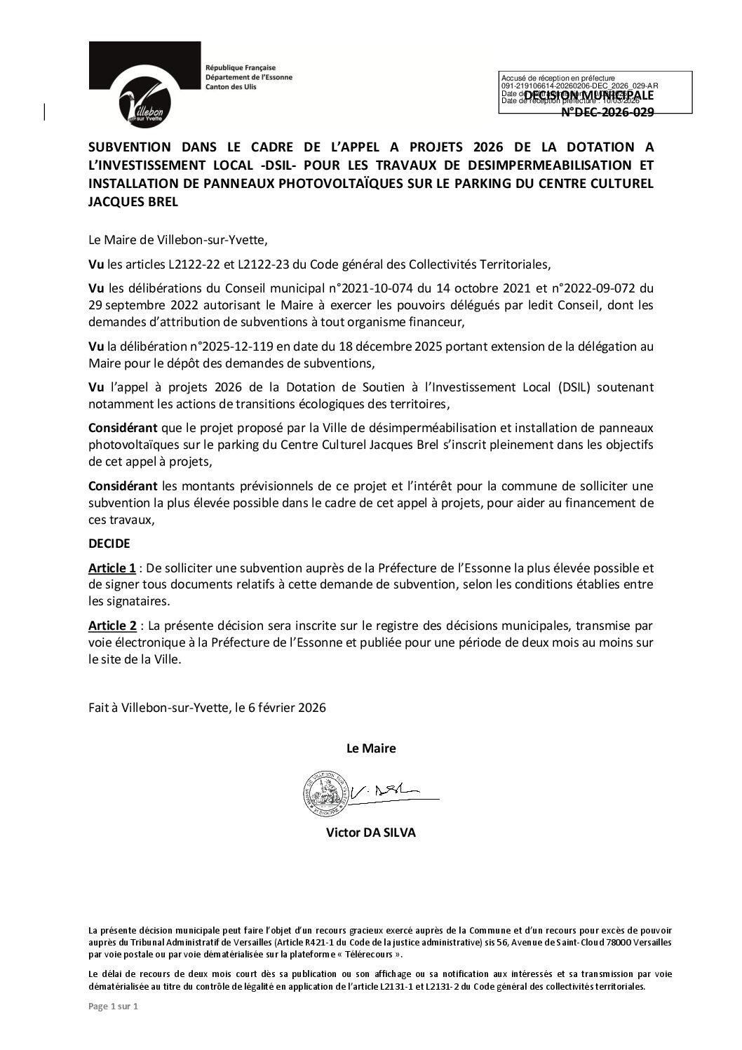Décisions municipales:DEC-2026-029 Subvention dans le cadre de l’appel à projets 2026 de la dotation à l’investissement local DSIL pour les travaux de désimperméabilisation et panneaux photovoltaïques CCJB