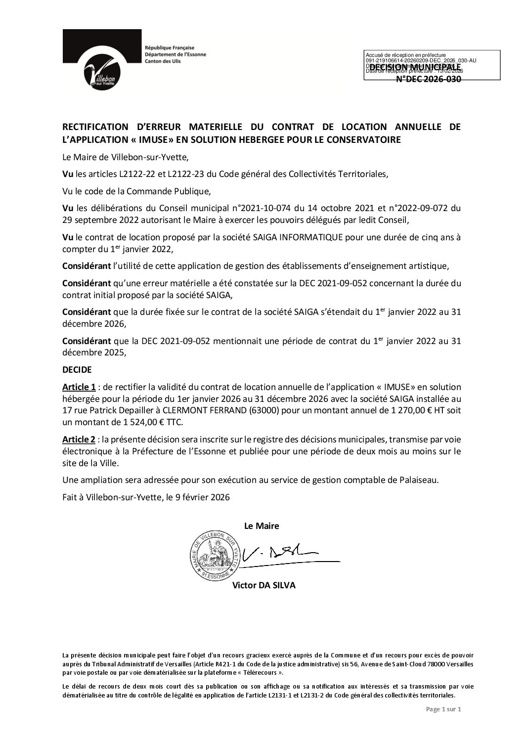 DEC-2026-030 Rectification d'erreur matérielle du contrat de location annuelle de l'application 'imuse' en solution hébergée pour le conservatoire