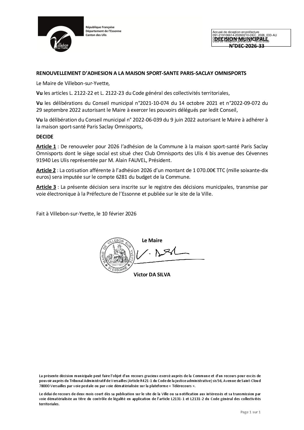 DEC-2026-033 Renouvellement d'adhésion à la maison Sport-Santé Paris-Saclay omnisports