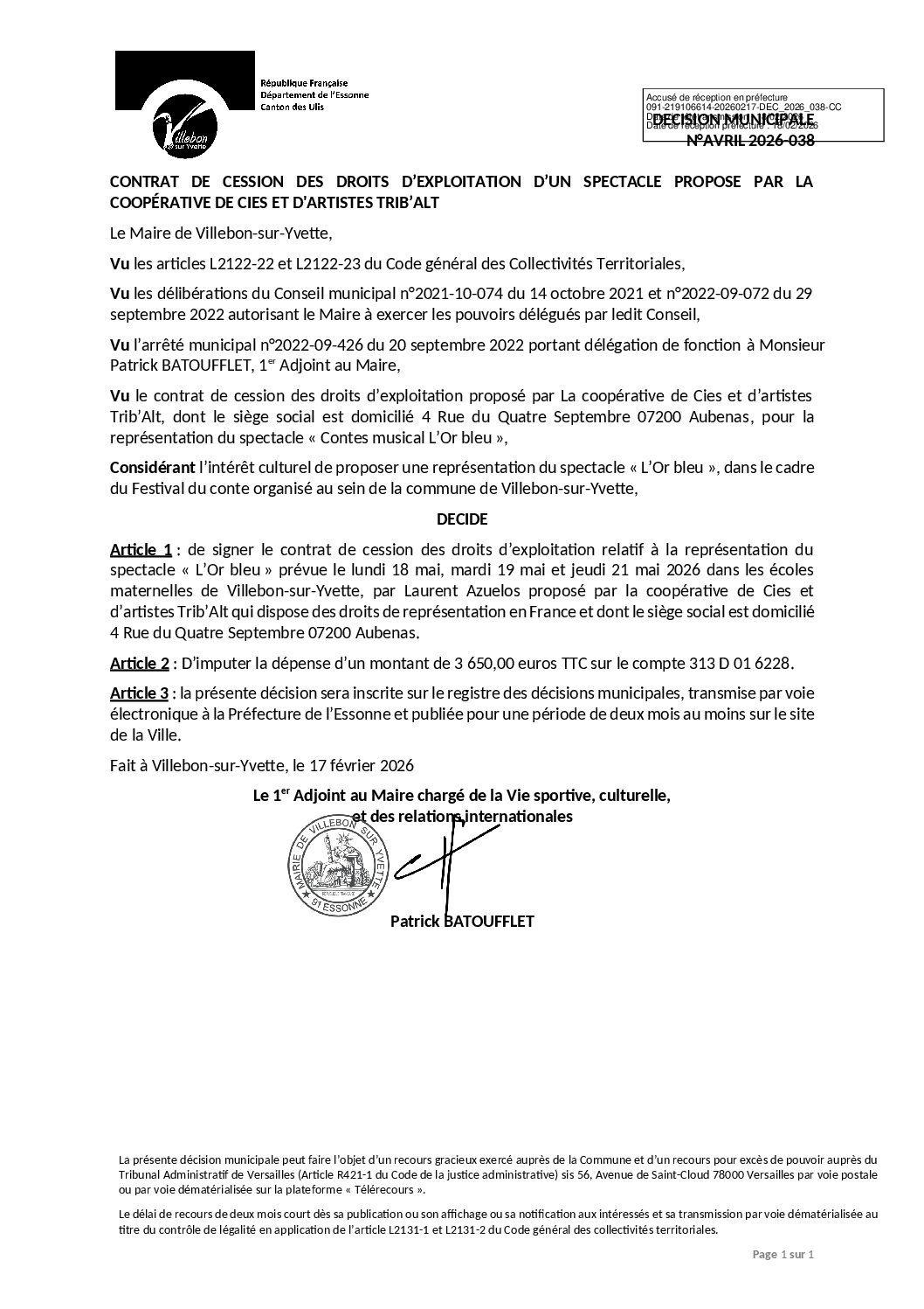 DEC-2026-038 Contrat de cession des droits d'exploitation d'un spectacle proposé par la coopérative des Cies d'artistes Trib'Alt