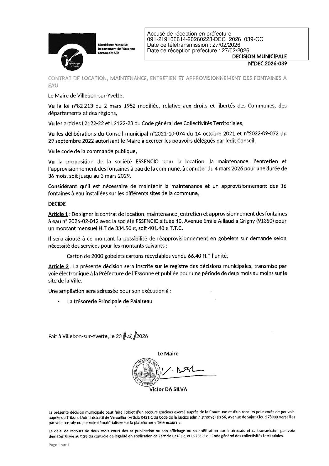 DEC-2026-039 Contrat de location, maitenance, entretien et approvisionnement des fontaines à eau