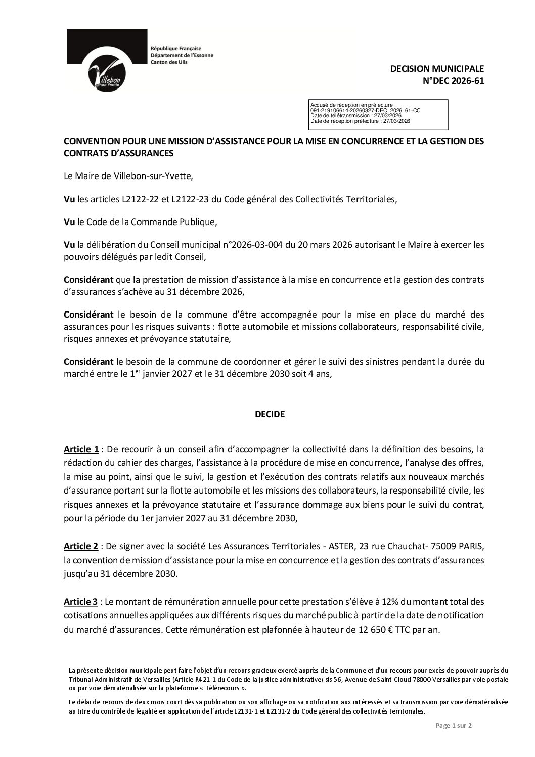 DEC-2026-061 Convention pour une mission d'assistance pour la mise en concurrence et la gestion des contrats d'assurances