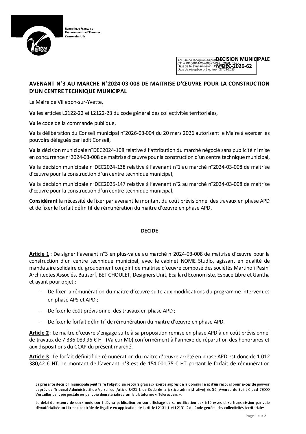 DEC-2026-062 Avenant n°3 au marché n°2024-03-008 de maîtrise d'oeuvre pour la construction d'un centre technique municipal