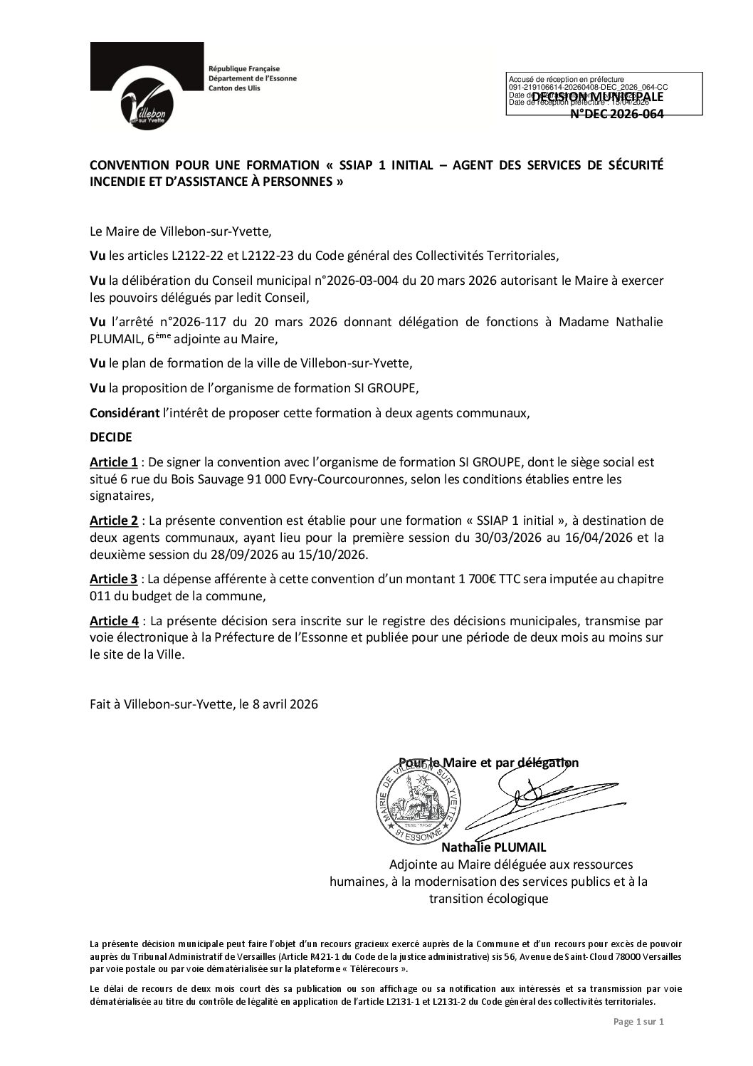 DEC-2026-064 Convention pour une formation SSIAP 1 initial- agent des services de sécurité incendie et d'assistance à personnes
