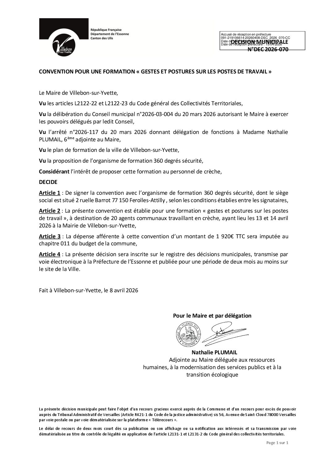 DEC-2026-070 Convention pour une formation gestes et postures sur les postes de travail